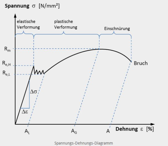 Obere Streckgrenze (ReH): Spätestens hier verlässt das Material den elastischen Bereich. Kleine Verformungen bleiben dann bestehen.